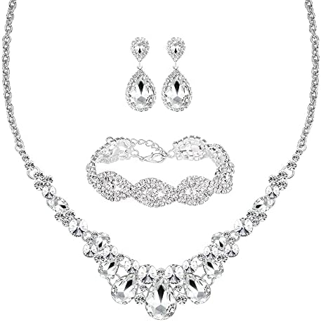 3 Pcs Women Crystal Jewelry Set Includes Bridal Wedding Rhinestone Choker Necklace Crystal Bracelets and Dangle Earrings