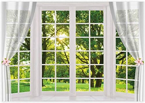 Allenjoy 8x6ft Fabric Spring Window Scenery Photography Backdrop White Windowsill Floral Green Forest Natural Photocall Background Party Banner Wall Decor Newborn Baby Kids Family Photo Booth Props