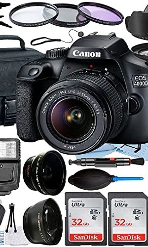 Canon EOS 4000D / Rebel T100 DSLR Camera 18MP with EF-S 18-55mm Lens + A-Cell Accessory Bundle Includes: 2 Pack SanDisk 32GB Memory Card + Flash + Case + Much More
