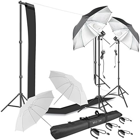 HYJ-INC Photography Umbrella Continuous Lighting Kit,Muslin Backdrop Kit(White Black), Backdrop Clips Clamp,10ft Photo Background Photography Stand System for Photo Video Studio Shooting
