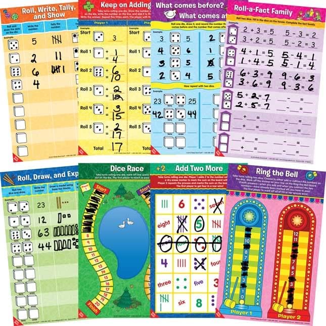 Really Good Stuff Math Mat Dice Games for Kids Ages 5 – 7 – Engaging Math Games – Dice Math Games for Addition, Subtraction, and More – Educational Games for School or Home – 8 Double-Sided Games