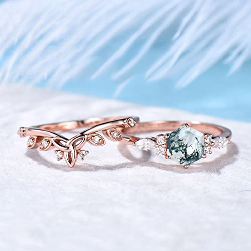 DETAILS: Material : 925 Sterling Silver (Hypoallergenic, Nickel Free, Tarnish Resistant)/10k/14k/18k solid gold metal – Main stone : 6x6mm Hexagon Cut Natural moss agate- side stone : Simulated Diamonds,wedding band stone : Simulated Diamonds ,Stone Cut : Hexagon Cut – Carat Weight: 1ct. (approx.)