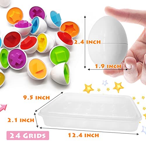 🥚Package includes:12 pcs matching eggs in total,come with 1 pcs plastic 24 grids egg holder,each egg measures 1.9 x 2.4 Inch,the egg holder measures 12.4 x 9.5 x 2.1 inch.