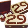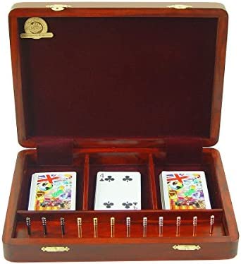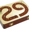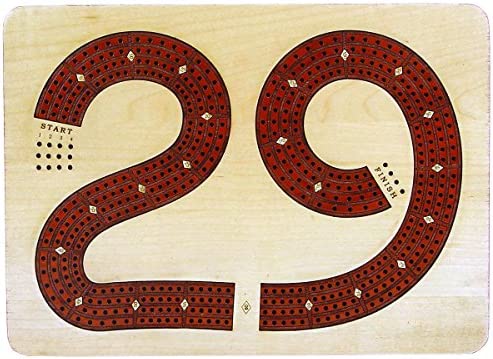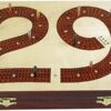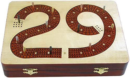 House of Cribbage presents exquisite 4 track (120 Points) 29 Digits Shape Continuous Cribbage Board & Box in Flat version. The handmade cribbage board/box is made of Maple/Bloodwood and through special inlay process, Bloodwood tracks are inlaid on the board with great precision. We DON'T USE any screen prints or paints to create numbers or tracks on cribbage board. Both the tracks and numbers on board are carved on natural Bloodwood and Maple respectively. The tracks are leveled with box height for your ease of playing and moreover the numbers on tracks are also carved and not painted or screen printed. One can't find such gorgeous handmade continuous cribbage board from any other source as this has been developed by our designing and research section with immense dedication. This kind of unique cribbage board with 12 metal pegs and box to store cards is being offered for the first time and is hardly available elsewhere. The Flat hinged cribbage box provides storage space for 3 deck of playing cards and also separate section for 12 cribbage pegs. Soft maroon velvet felt has been applied inside the storage section and free velvet cover is also provided to protect the board.