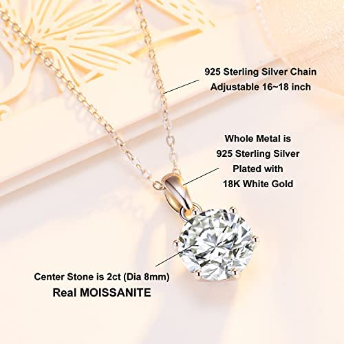 【TOP GRADE MOISSANITE】: This moissanite necklace for women with center stone 2ct (Dia 8 mm). D-E color grade make it looks clear, pendant setting metal is 18k white gold Over Sterling Silver. The stones feature hand made setting instead of wax setting, to ensure our stones are stronger and safer on the setting; On the other hand, the hand made setting will make the stones look more neat and will not uneven, to ensure a high-end outlook.