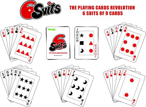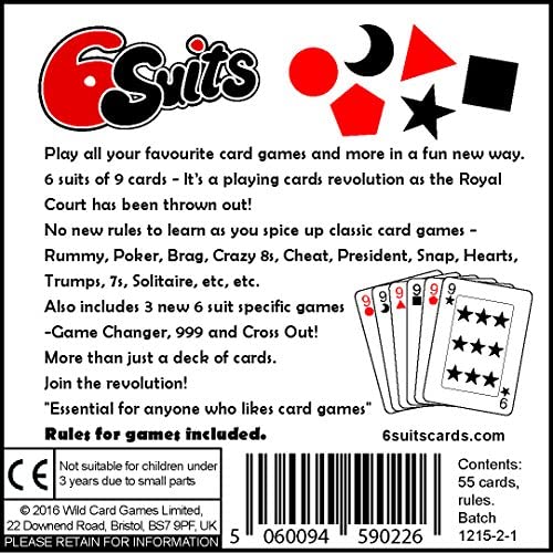 Play all your favorite card games and more in a fun new way with this special deck of playing cards. With 6 suits of 9 cards – It’s a playing cards revolution as there are no crowns in this deck as the Royal Court have been thrown out. No new rules to learn as you spice up classic card games – Rummy, Poker, Brag, Crazy 8s, Cheat, President, Hearts, Trumps, Sevens, Texas Holdem, Canasta, Snap, Solitaire, etc. Also includes 3 new 6 suit specific games -Game Changer, 999 and Cross Out! More than just a deck of cards. Join the revolution! “Essential for anyone who likes card games” Rules for games included.