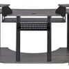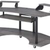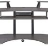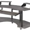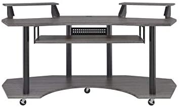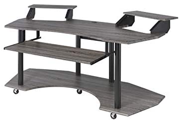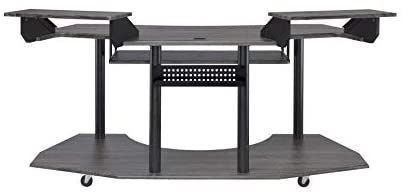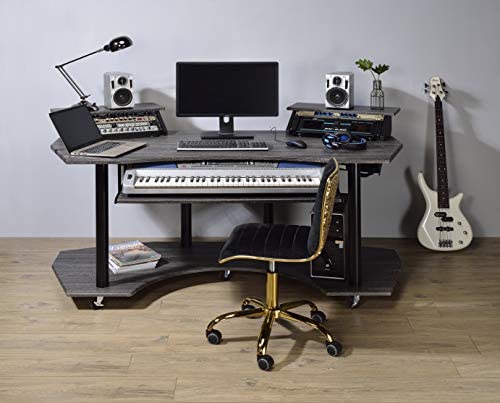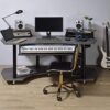 Upgrade your home office with the contemporary look of the black, inspiring Eleazar music recording studio desk. This workstation is crafted in black oak finish with wooden top and base with metal support. Features pull-out keyboard tray, 2 speakers stand, and bottom shelf. Caster wheels are included for you to move along with your exclusive creativity.