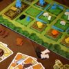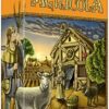 In Agricola (Latin for “farmer”), you’re a farmer in a wooden shack with your spouse and little else. On a turn, you get to take only two actions, one for you and one for the spouse, from all the possibilities you’ll find on a farm: collecting clay, wood or stone; building fences; and so on. You might think about having kids in order to get more work accomplished, but first you need to expand your house. And what are you going to feed all the little rug rats? Agricola is a turn based game. There are 14 game turns plus 6 harvest phases (after turn 4, 7, 9, 11, 13, and 14). Each player starts with two playing tokens (farmer and wife) and thus can take two actions per turn. There are multiple options, and while the game progresses, you’ll have more and more: first thing in a turn, a new action card is flipped over. Problem: Each action can be taken just once per turn, so it’s important to do some things with high preference. Each player also starts with a hand of 7 Occupation cards (of more than 160 total) and 7 Minor Improvement cards (of more than 140 total) that he may use during the game if they fit in his/her strategy. This amounts to countless strategies, some depending on your card hand. Sometimes it’s a good choice to stay on course, sometimes you better react on what your opponents do. Agricola can also be played without cards (family game) and can even be played solo. Designed by Uwe Rosenberg.