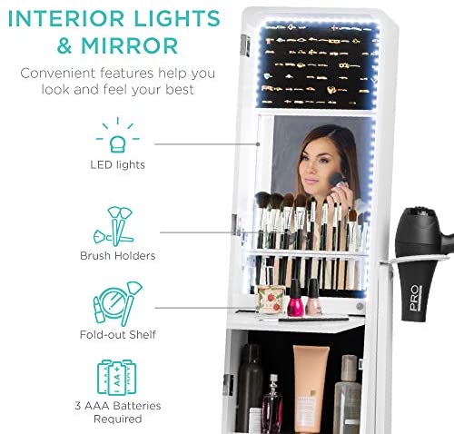 AMPLE STORAGE SPACE: A stylish velvet interior protects jewelry from scratches while your mirror features makeup shelves, brush holders, and a hairdryer mount so you can have all your essentials at hand