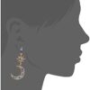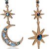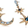 Betsey Johnson mismatched earrings featuring celestial stars and crescent moon embellished with crystal and blue tonal colored stone accents and textured details. Earrings are set in gold-tone metal with a post back closure.