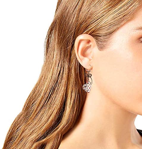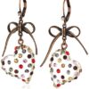 Betsey Johnson dangle earrings featuring bow and delicate chain with clear lucite heart drop embellished with mixed multi-colored stones. Earrings are set in light copper-tone metal with a lever back closure.