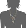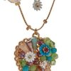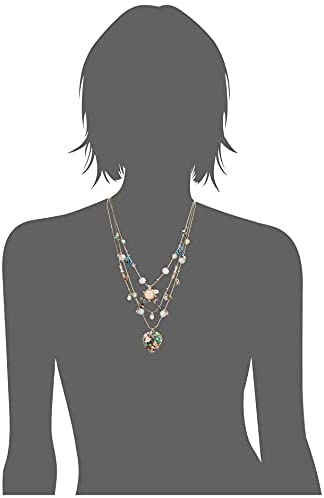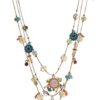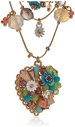 Betsey Johnson illusion necklace featuring mixed faceted beads, delicate stone accents, lovely flowers and heart embellished with woven mixed multi-colored charms. Necklace is set in gold-tone metal with a lobster clasp closure.