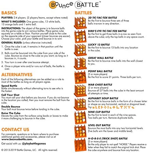 3D Tic-Tac-Toe Battle: Be the first to bounce three sets of three balls in-a-row in any direction.Bird’s Eye Tic-Tac-Toe Battle: Be the first to get three balls in-a-row as seen from above the cube; only the top balls in any space count.Lucky 13 Battle: Be the first to bounce 13 balls into any location in the cube.Great Wall Battle: Be the first to bounce nine balls into the wall closest to you.Point Ball Battle: Be the first to score 21 points. Three balls per turn.War Chest Battle: Bounce all 27 balls into the cube in the least amount of attempts or time.Alphabet Soup Battle: Be the first to bounce balls in the form of a chose letter or shape on any horizontal, vertical or diagonal level.Nine Cup Battle: Be the first to land in each of the nine spaces (or “cups”). Two balls per turn. Remove duplicate balls from cups.Level Out Battle: Bounce the most balls into any two horizontal levels (five balls win the lower and middle level).H-O-R-S-E (Trick Shot) Battle: Be the only player to not spell “HORSE.” Players receive a letter when they fail to match the original trick shot. Place the cube anywhere and bounce from any location.