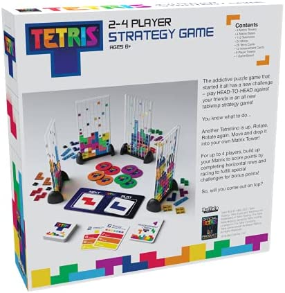 Tetris- Head-To-Head Multiplayer Strategy Game Now play Tetris head-to-head against your friends in an all-new tabletop strategy game for up to 4 players designed by Phil Walker-Harding. Each player drops tetrimino pieces into their own Matrix tower each turn. You know what to do. Another piece is up. Rotate. Rotate again. Move it and drop it… Score points by completing horizontal rows and racing to fulfill special challenges on achievement cards for bonus points! Place specific pieces to match the icons on your Matrix towers to earn even more. Who will come out on top?!