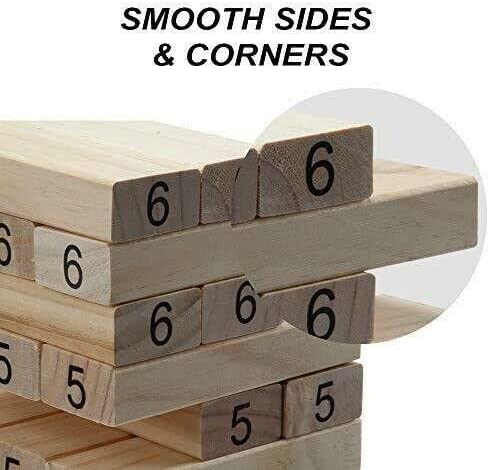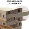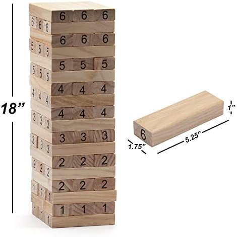 – The set comes with 54 wooden blocks that are 5.25” x 1.75” x 1” timbers for a full 18 story, you can stack to over 3 feet high during play!