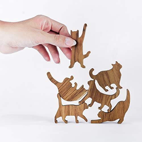 Your favorite cats have grown up! With six(6) kitties (note: each cat is about 2″ x 3″ x 1/2″, made of high quality solid teak) in a set/box, you can stack or place them in a row of any order, creating endless fun ways to play with them. In their competition climbing to the top, a careless step might cause them to fall; but don’t worry, they can always try again. Just make sure the next step is secure; that’s how they can reach higher ground! [We produce the Cat Pile in a small family owned wood shop as opposed to conventional large volume wood factory. A lot of work and attention to details are put into making of the kittens, from initial wood selection to cut quality to final packaging. There are also quite a few handmade steps involved thus our production rate is not as fast, but that’s how we ensure that these wooden kittens achieve consistent high quality. Thank You all Cat Lovers out there for loving our cats and supporting our small family business!]