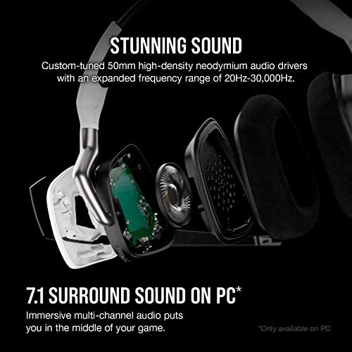Immerse yourself in the action with the Corsair void RGB Elite wireless with custom-tuned 50mm neodymium audio drivers delivering 7.1 surround sound on PC Microfiber mesh fabric and memory foam ear pads provide lasting comfort Connect to your PC or PS4 with a low-latency 2.4GHz wireless connection with a range of up to 40ft and all-day battery life up to 16 hours An omnidirectional microphone with LED mute indicator ensures that you’re heard with exceptional vocal clarity The void RGB Elite’s distinctive design and durable construction are complemented by fully customizable RGB lighting on each ear cup Powerful Corsair iCUE software ties everything together enabling full control over equalizer settings 7.1 surround sound RGB lighting.