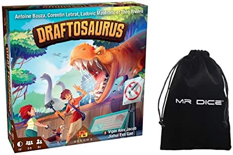 Ankama Draftosaurus board game bundle with Mr Dice drawstring Bag. Your goal in Draftosaurus is to have the dino park most likely to attract visitors. To do so, you have to draft dino meeples and place them in pens that have some placement restrictions. Each turn, one of the players roll a die and this adds a constraint to which pens any other player can add their dinosaur. Draftosaurus is a quick and light drafting game in which you don’t have a hand of cards that you pass around (after selecting one), but a bunch of dino meeples in the palm of your hand.