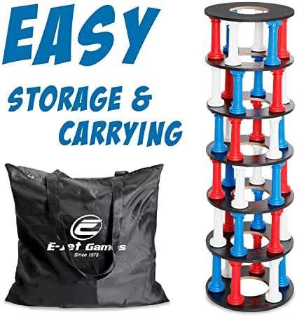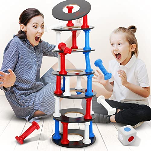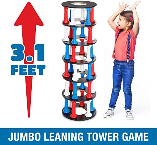 Comes with a jumbo size 3.1Ft tall leaning tower for stacking game, providing extra excitement with the oversize feature. Provides hours of entertainment for everyone of all ages. Build a tower by placing 6 colored columns per deck in a turn-based game. Players will take turns rolling the dice, then carefully removing the pull of a corresponding color block without crashing the tower to win. The colorful blocks come with a smooth surface making them easy to remove. Test your skills and patience against this unusual jumbo size column tower game. Promotes logical thinking, active movement and creativity. Challenge yourself or play with friends and family. All it takes is skill, strategy, and luck! Includes a carry bag for you to put all the accessories inside, easy for storage and carrying to anywhere.Simple Game, Timeless Fun. An exciting game for family night, parties, and more. Perfect family game for both adults and children, ensure everyone will enjoy playing this game together. Suitable for two or more players.What’s included:Color Block x 36, Decks x 7, PU Foam Dice x 1, Carry Bag x 1, Instruction Manual x 1