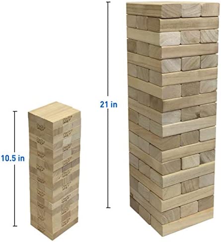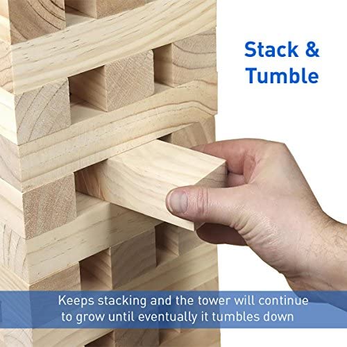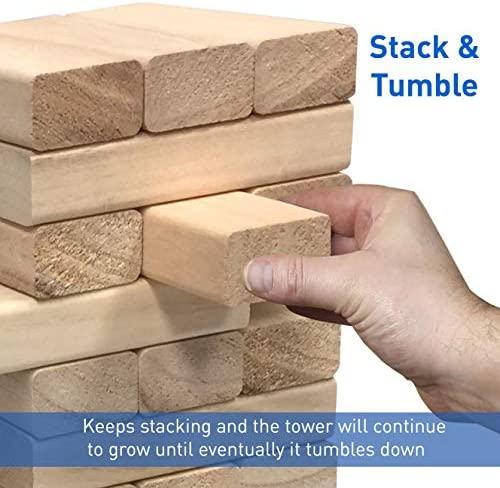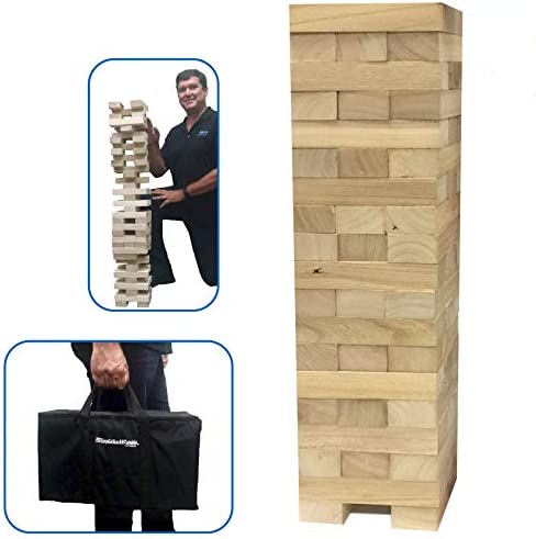 EXCITING AND CHALLENGING GAME! Stack blocks by pulling blocks out of the body of the tower and replacing them at the top without the tower falling over. Keeps stacking and the tower will continue to grow until eventually it tumbles down. Develop fine motor skills as this game requires a steady hand, a good eye for balance, and it will enhance your concentration. The suspense builds as the tower grows keeping the game exciting! These are big, wood blocks, not cardboard. Starts at over 2 feet tall with 24 rows when playing this classic outdoor lawn game. When stacked goes to almost a life size 4 feet tall! These wooden blocks are cut to rigid specifications. The Stack & Tumble is the perfect family fun game and ultimate party game! Great for youth groups, tailgating, BBQ, camping and special events. A big canvas storage bag is included for convenient storage and transport.
