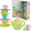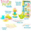HOW TO PLAY: Flip a challenge card and find the first teacup shown. Race to place it on your saucer and continue, relay-style, until your tower matches the stack on the card. Correctly complete the tower and ring the teapot bell first and you win the game. Includes eight plastic teacups, eight saucers, 10 order cards, a teapot, two tea serving trays, and teacup cupboard (box bottom)