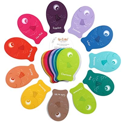 eeBoo’s new take on an old game involves fish-shaped cards and color matching, with bold colors like hot pink and chartreuse. A great first card game that is easy to play. Illustrated by Julia Gorton.