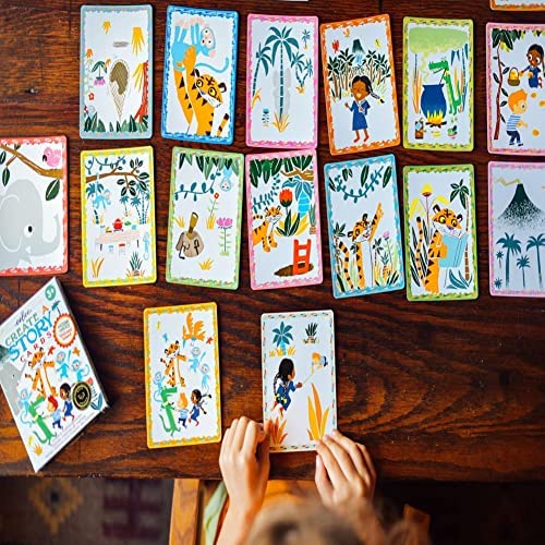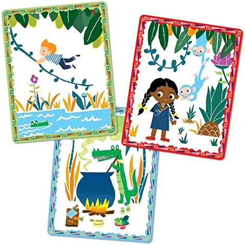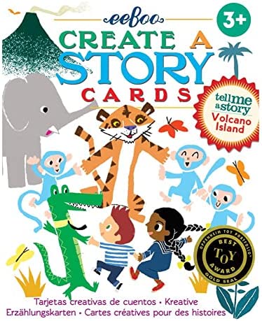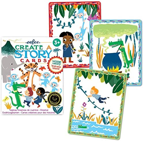 eeBoo’s Volcano Island Create a Story begins with a tiger, three blue monkeys, a pair of children and a volcano…. Is there hot lava involved and what about the other animals that show up in your own story? Recurring characters, locations, and props encourage linking the cards in endless combinations for fresh, new stories every time it’s played. Colorfully illustrated by Alex Barrow.