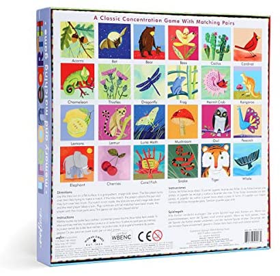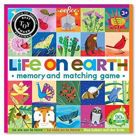 eeBoo’s Life on Earth Memory and Matching Game promotes memory and matching skills while teaching children about flora and fauna and other wild life from around the world. Twenty-four different and colorful illustrations depict animals, leaves, birds, fish and more on sturdy and thick tiles. A great skill building game that can be played alone or with others. This memory and matching game will delight children while they practice their memory and focus. Featuring art by Melissa Sweet. Winner of Oppenheim Platinum Best Toy Award.