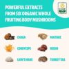 Organic Chaga Sclerotium Extract, Organic Cordyceps Fruiting Body Extract, Organic Lion’s Mane Fruiting Body Extract, Organic Maitake Fruiting Body Extract, Organic Turkey Tail Fruiting Body, Organic Reishi Fruiting Body Extract, Pullulan (Plant Capsule)