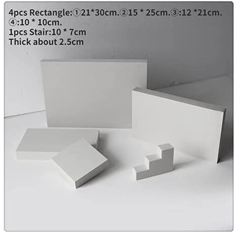 Size:The set has 4 rectangle foam photography props length *high approx:3.9*3.9in/10*10cm;4.7*8.2in/12*21cm;5.9*9.8in/15*25cm;8.2*11.8in/21*30cm.The stair approx 3.9in*2.7in/10*7cm of length *high.