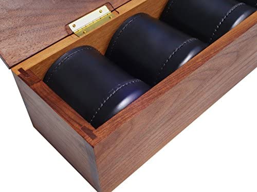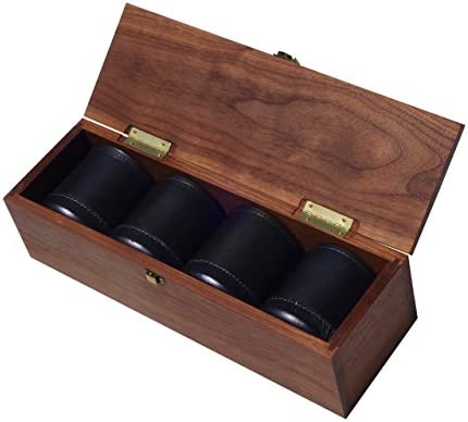 Set of 4 heavy-duty all leather regulation-size dice cups, saloon quality 3-7/8″ tall, 3-1/4″ diameter. These cups feel great in your hand and are built to last. Stitched leather construction, so strong you can stand on it.