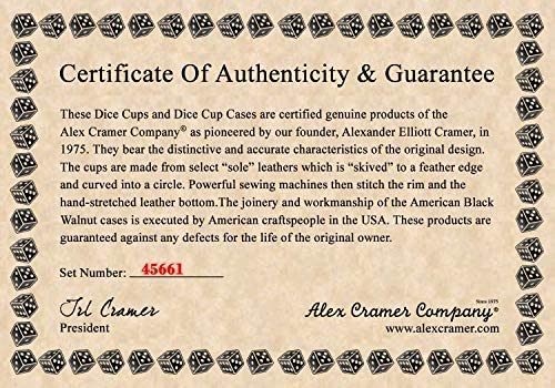 Our product is guaranteed for life against any dice cup or case defects or breakage. We have a “no questions asked” return & replacement policy. If you chip, break or even lose one of our dice, we will supply a free replacement. Each set contains a “Certificate of Authenticity & Guarantee.”