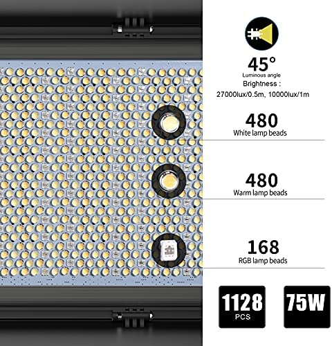 Powerful RGB Led Video Light: 2022 Upgraded RGB video lights, 75W high power light, Consist with 1128pcs Highlight LED beads, lumen is 27000lux/0.5m,11000lux/1m. Larger and longer light-emitting area. This video light is adopted by the American Chip and has a life of more than 300000 hours. Provide the true and natural color for Photography, YouTube Studio, Video Shooting, Broadcasting, etc.