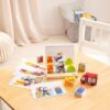The template cards (which slide easily into the base and come in 3 degrees of difficulty) encourage children first to simply line up the figures to match the picture. Next to use their fine motor skills to stack the figures and finally to arrange them in layers front to back!