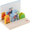 Set includes 8 chunky beech wood pieces with different illustrations on front and back, allowing for 16 possible choices when constructing a scene. Includes 5 double sided template cards and a baseplate made of birch plywood measuring 6″ x 4.5″