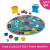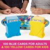 Includes gameboard, 100 blue cards for adults, 100 yellow cards for kids, 2 cardholders, 6 scoring tokens, 36 scoring wedges, die and instructions