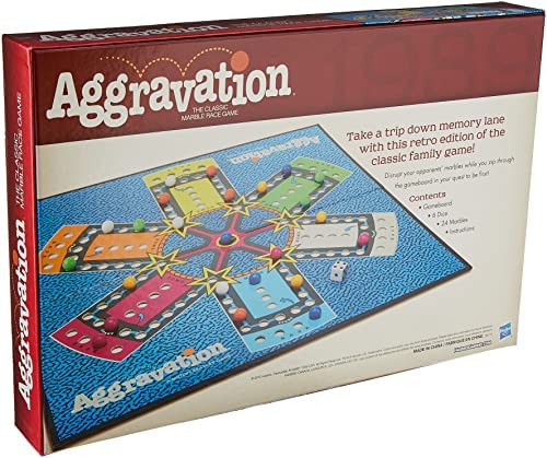 Take a trip down memory lane with this retro 1989 edition of the fun family-favorite, the Aggravation Game! It’s The classic marble race game where 2 to 6 players compete. Opponents race around the board from base to home, disrupting each other’s marbles in the quest to be first. A shortcut might be helpful, but be careful! It just might set you back instead. The first player to move their marbles around the board to home wins. Remember, “aggravating” other players in this game is encouraged and super fun! Hasbro Gaming and all related terms are trademarks of Hasbro.