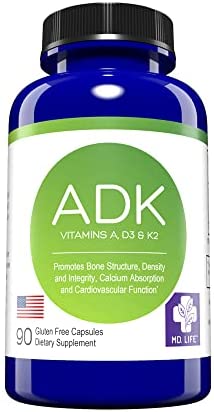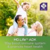 SUPPORTS HEART HEALTH: MD Life ADK vitamin supplement promotes healthy heart and blood vessel function. Specifically, vitamin K activates proteins in the body which helps prevent the calcification in your arteries which may result in plaque buildup.