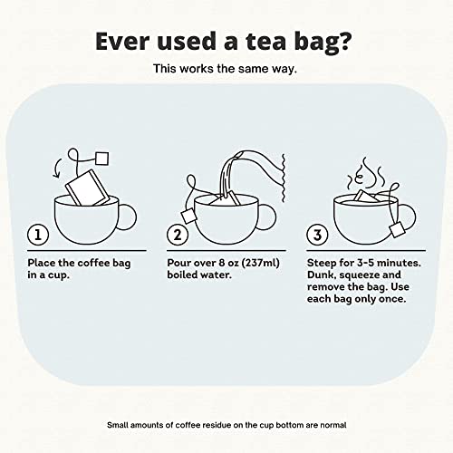 Fast and easy to brew (like a steeped tea bag): place coffee bag in a cup. Pour over 8 oz (237ml) boiled water. Steep for 3-5 minutes. Dunk, squeeze and remove the bag. Individually sealed coffee pouches are single use only. Coffee residue on mug bottom is normal