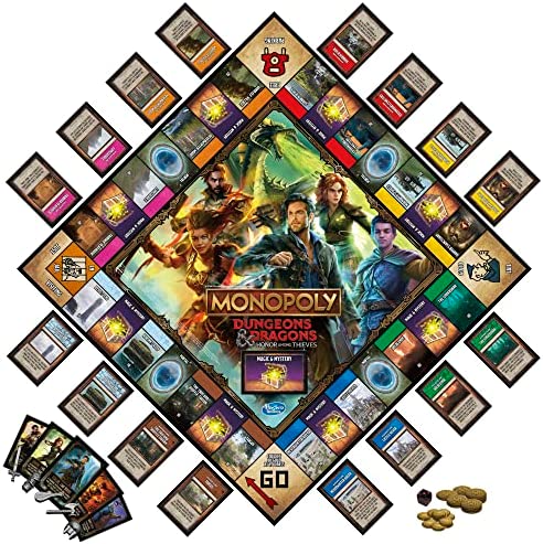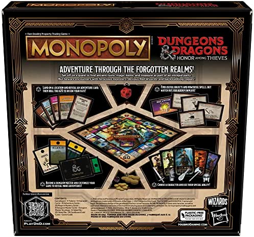 Adventure across a land of magic and monsters with the Monopoly Dungeons & Dragons: Honor Among Thieves game, inspired by the D&D movie! This immersive board game features key characters and locations from the film. Players can explore the Forgotten Realms as part of an intrepid adventuring party. Discover adventure around the Sword Coast and the perilous Underdark, seek out useful items and powerful spells, and collect treasure. But watch out for monsters, devious Red Wizards, and backstabbing rogues! The game ends when all locations have been secured. The player with the most gold wins! This D&D adventure game is for ages 8 and up, and it makes a great gift for fans of Dungeons & Dragons and the Monopoly game. © 2022 eOne and Paramount Pictures Corporation. All Rights Reserved. Dungeons & Dragons and all related trademarks and logos are trademarks of Wizards of the Coast. ©2022 Wizards of the Coast. The Hasbro, Hasbro Gaming, Parker Brothers, and Monopoly names and logos, the distinctive design of the gameboard, the four corner squares, the Mr. Monopoly name and character, as well as each of the distinctive elements of the board and playing pieces are trademarks of Hasbro, Inc. for its property trading game and game equipment. © 1935, 2022 Hasbro.