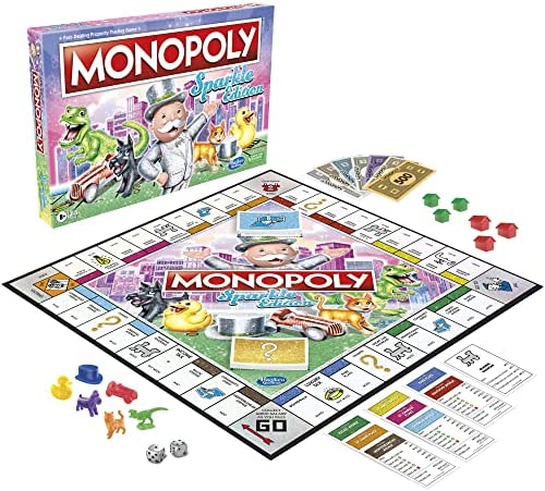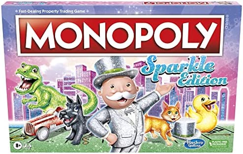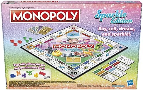 The Monopoly Sparkle edition family board game features a glittery, sparkly theme! It includes 6 glitter-infused Monopoly tokens, pearlescent dice, as well as glitter-infused Houses and Hotels.