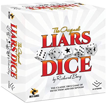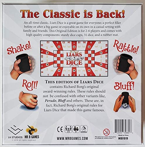 Liars Dice by Richard Borg: An all-time classic, we are excited to bring this great game back to print! A great game for everyone; a perfect filler before or after a big game or enjoyable on its own in a casual setting with family and friends. The 30th anniversary edition is for 2-6 players. The game comes with high quality components: Sturdy dice cups, dice and rubber mat.