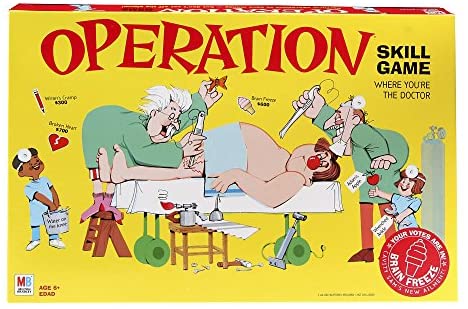 In the operation game, Kids get to be the Doctor and make cavity sam better or get the buzzer! Perform successful action noted on the cards by picking funny ailment pieces out of the game tray with a pair of tweezers. But watch out! If the tweezers touch the sides of the openings, the buzzer goes off and cavity Sam’s nose lights up! Then players look for their specialist card that fits that action to earn an even higher fee. The player with the most money after all of the fun A to my parts have been removed wins the game!