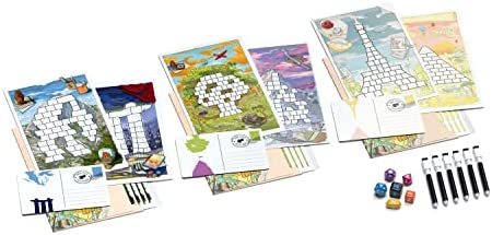 A roll and write where everyone uses the same dice every turn, trying to fill their landmark first, with bigger and bigger numbers as you go up.