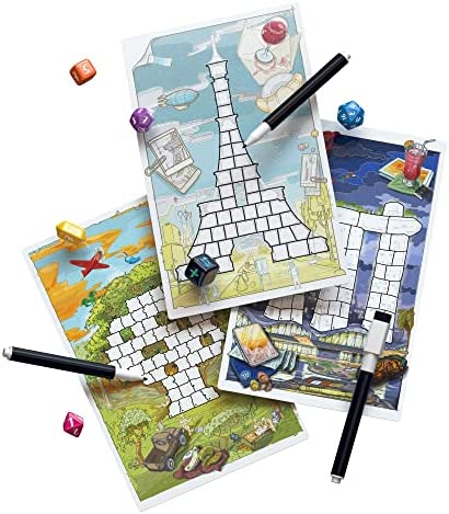 Compete in a series of roll and write boards, each illustrating one of the exciting stops on this world-wide journey, and try to be the first player to fill in all the boxes and make it to the top of the landmark.