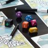 All players will pull from the same pool of numbers, rolled on the active dice, using the values to make their way up from the bottom to the top of each landmark. Numbers must increase as you climb, so combine the values carefully! Each location will bring with it a series of unique rules, mixing up play and adding to the challenge!