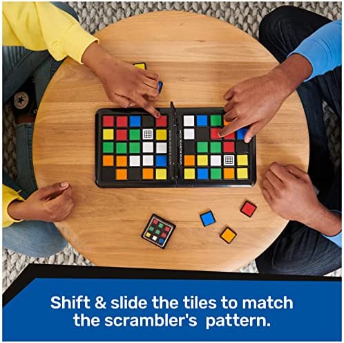 SHIFT, SLIDE, & SOLVE: Shake the scrambler and race against your opponent. Shift and slide the tiles to become the first racer to match the 3×3 center of the scrambler’s Cube pattern. But beware- your opponent may put in blockers or wild tiles to stop you in your tracks!