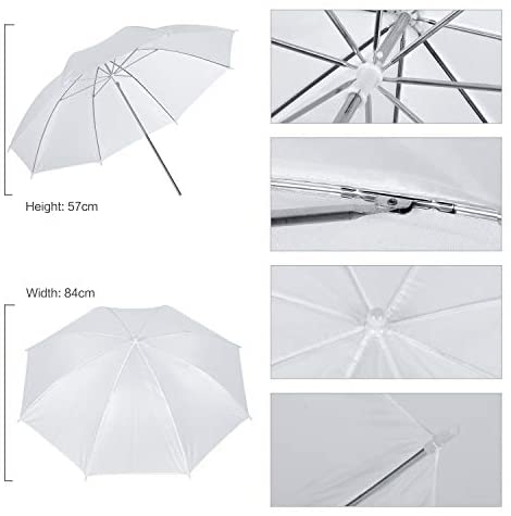 33″/84cm white umbrella: It is also equipped with two energy-saving bulbs, made of high-quality nylon structure and aluminum shaft, which can provide extremely soft beams and eliminate shadows for better lighting effects.