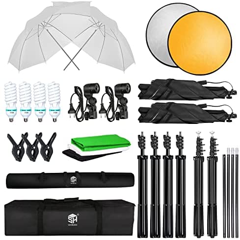 The kit includes:【4】79″/7 Feet/200cm Light Stand+【2】E27 Single Head Light Holder+【4】85W LED Bulb +【2】33″/84cm Umbrella+【2】20″x27″/50x70cm Softbox+【1】1.8 x 2.8M/6 x 9 ft Musline Backdrop(Black,White and Green)+【3】Backdrop Clamps+【1】2.6M x 3M/8.5ft x 10ft Background Stand Support System+【1】60cm/23″ Reflector(sliver/gold)+【1】Carry bag.