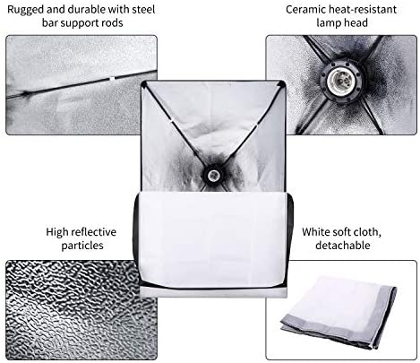 20×28 inch/50×70 cm soft box: It is equipped with two energy-saving bulbs, which act as a high-efficiency reflector by guiding the light to the inner surface of the aluminum-plated fabric to produce evenly diffused light.